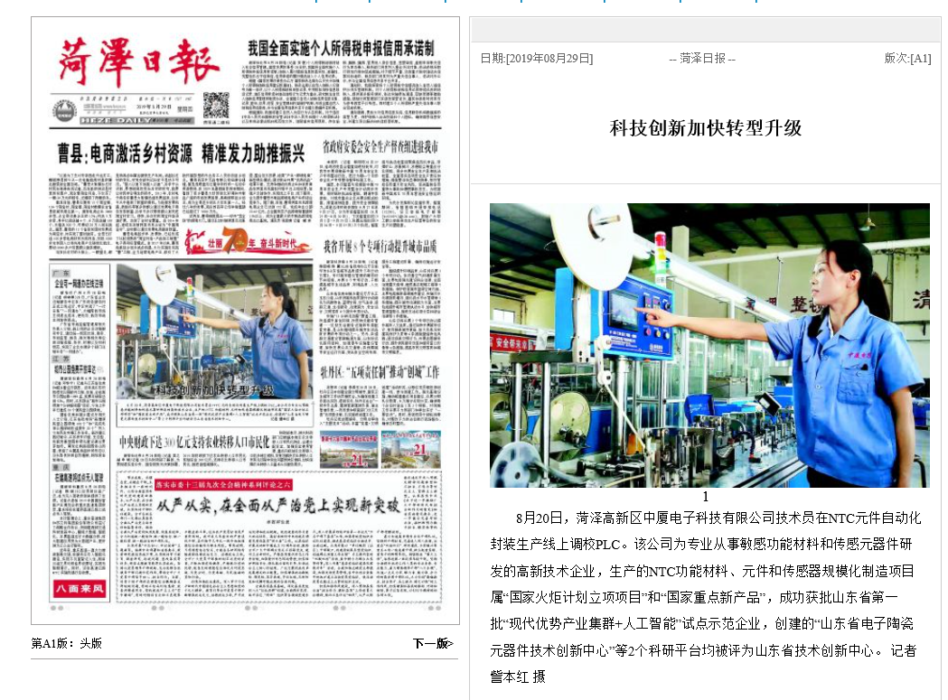 2019年8月29日《菏澤日?qǐng)?bào)》報(bào)道:“科技創(chuàng)新加快轉(zhuǎn)型升級(jí)”。中廈電子科技有限...